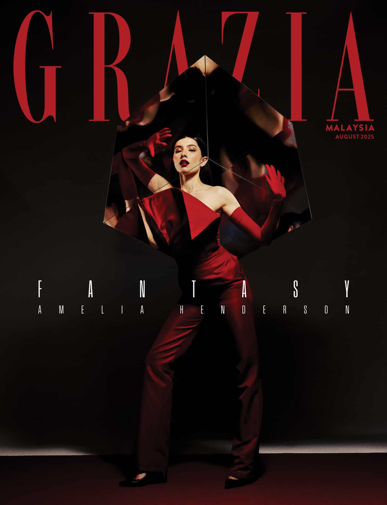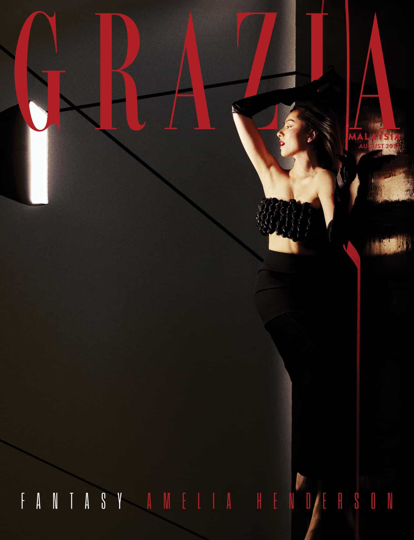 Amelia Henderson graces the double cover of Grazia Malaysia's August 2025 issue, dressed in DIKSON MAH.
