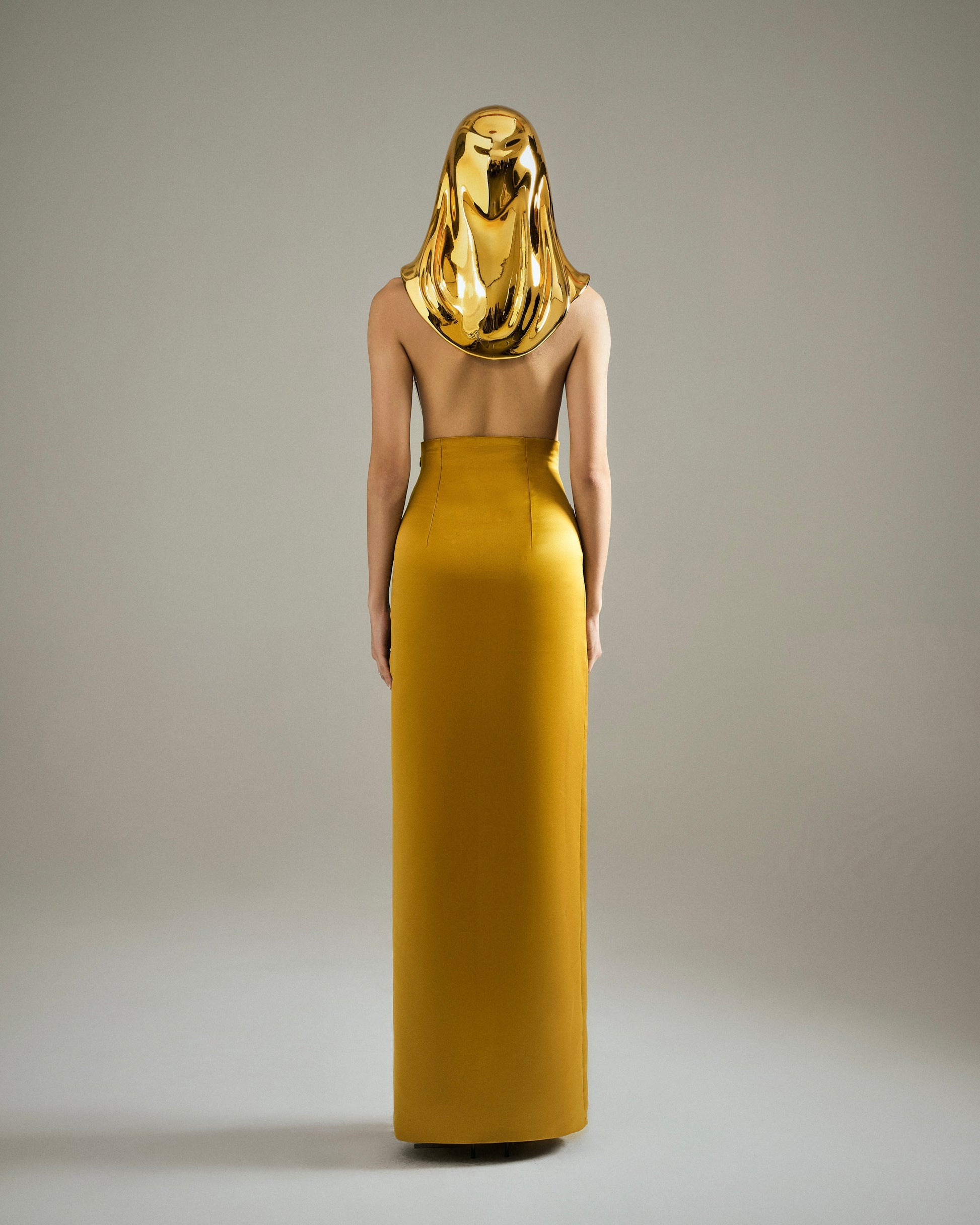 A 3D printed headpiece top inspired by the passage of time. Finished in gold chrome and paired with a matching satin skirt, the look balances between flow and fluidity, framing the face to create a surrealist look.