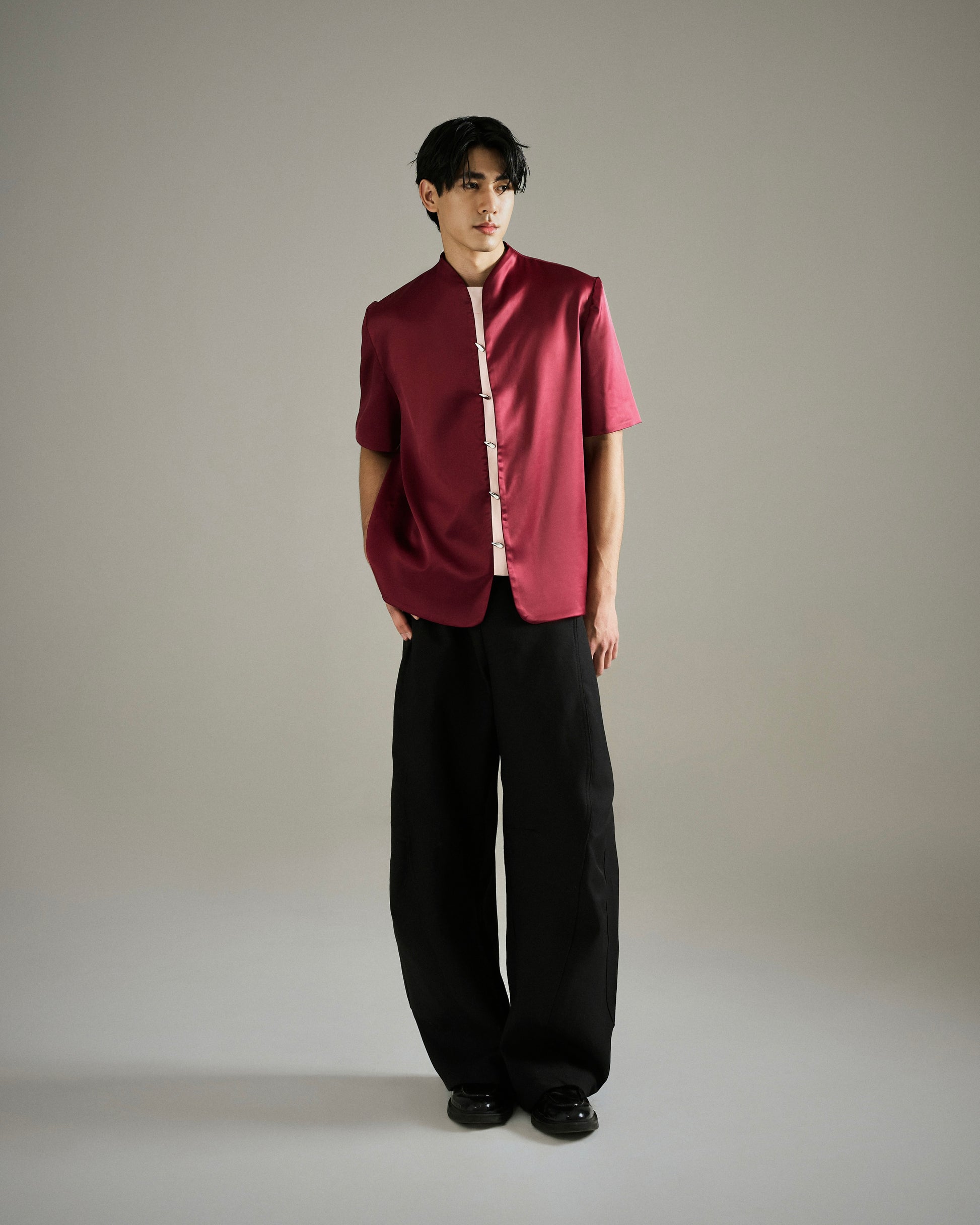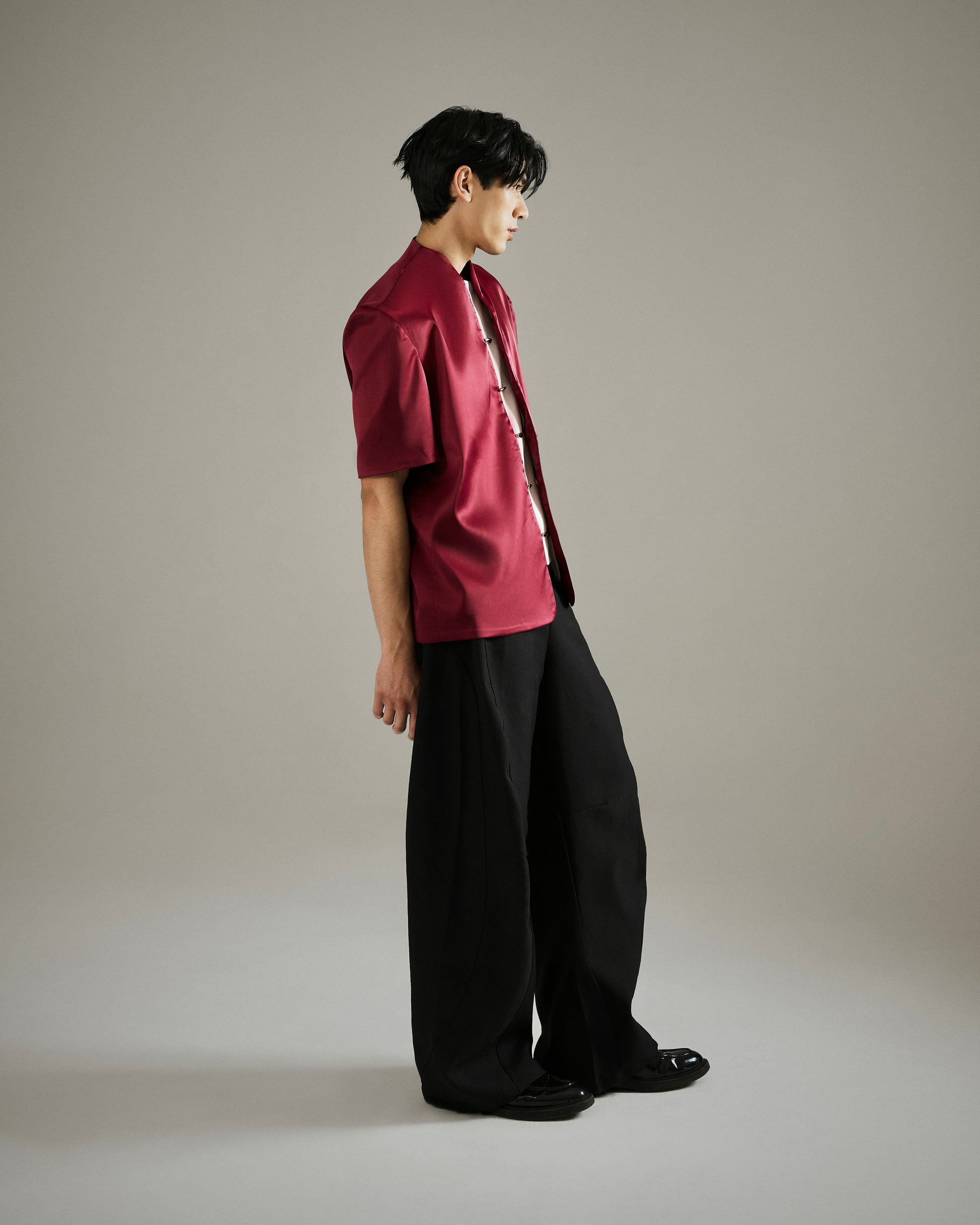 Structured short-sleeved raised collar men's shirt crafted from liquid metal fabric. Oversized fit frames the body for a sculpted, refined silhouette while contrast centerline with silver embellishment adds a focal point that brings a modern edge. Fully lined and features a curved hem and hidden front button opening.