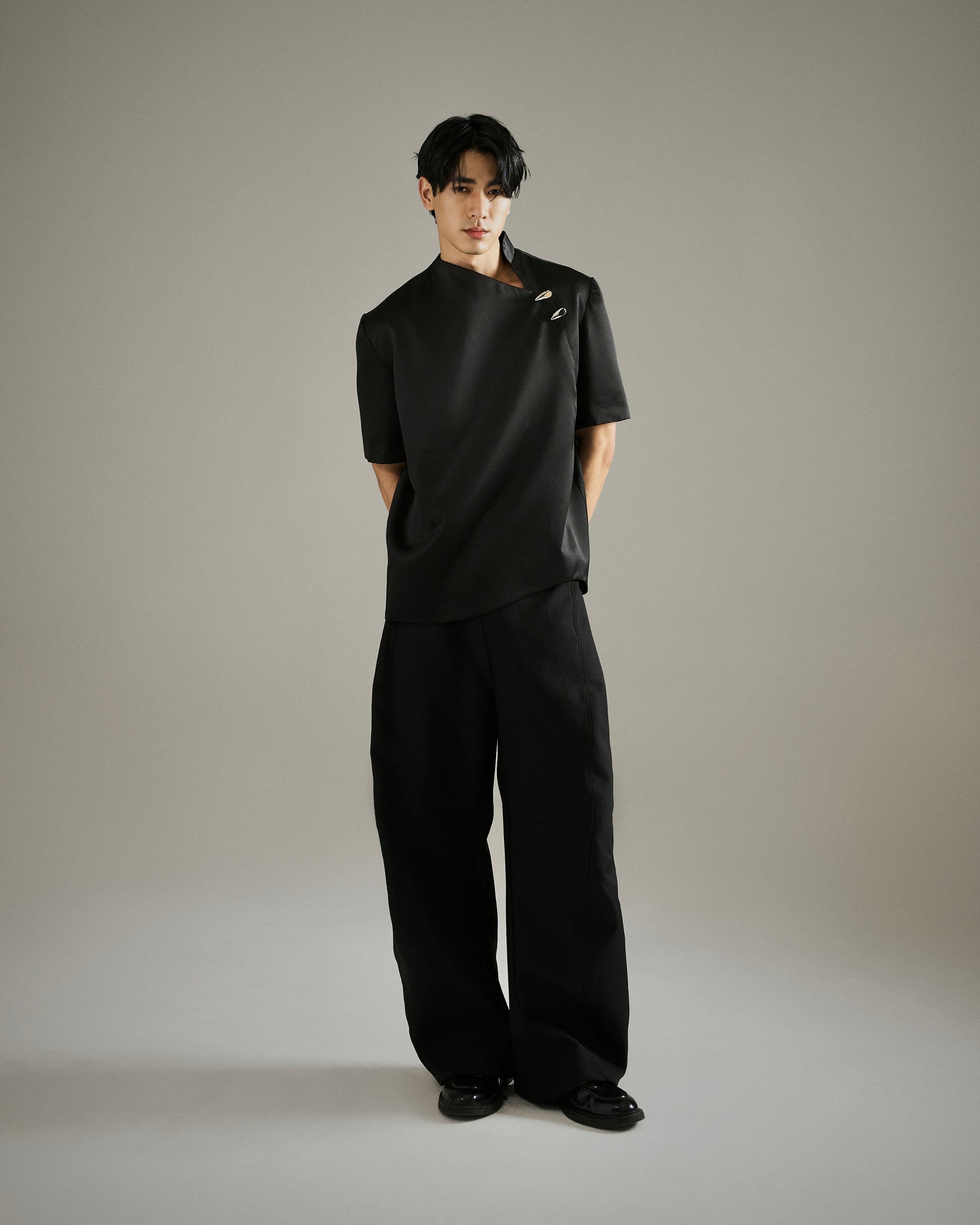 Asymmetrical short-sleeved men's shirt with a curved waveform hem. Oversized fit frames the body for a sculpted, refined silhouette while the angled neckline and split raised collar frames the face for a timeless look. Fully lined and features silver embellishments and hidden front button opening.