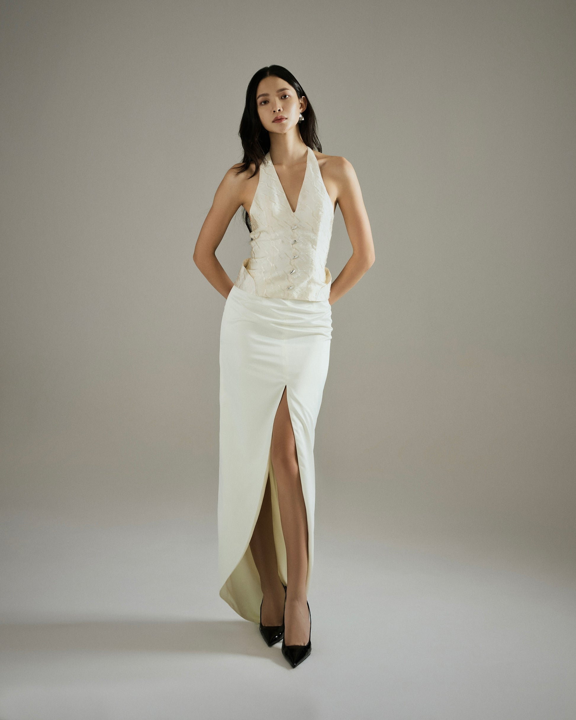 BOTTOM: Floor-length maxi skirt with a front cutout. Sleek and streamlined fit elongates the frame of the body, while bold cutout at the front adds a focal point that balances elegance with edge. Fully lined and features an invisible side zip opening.