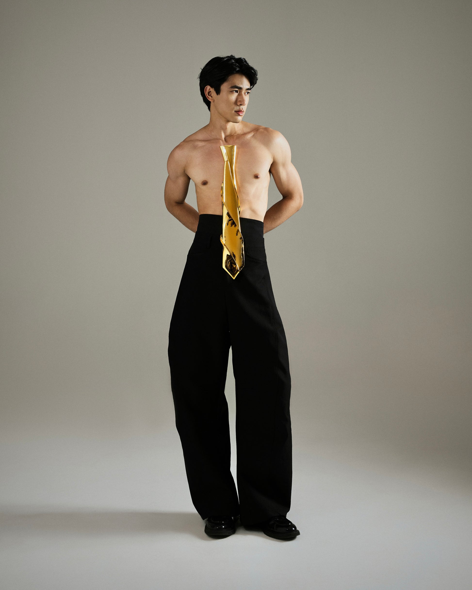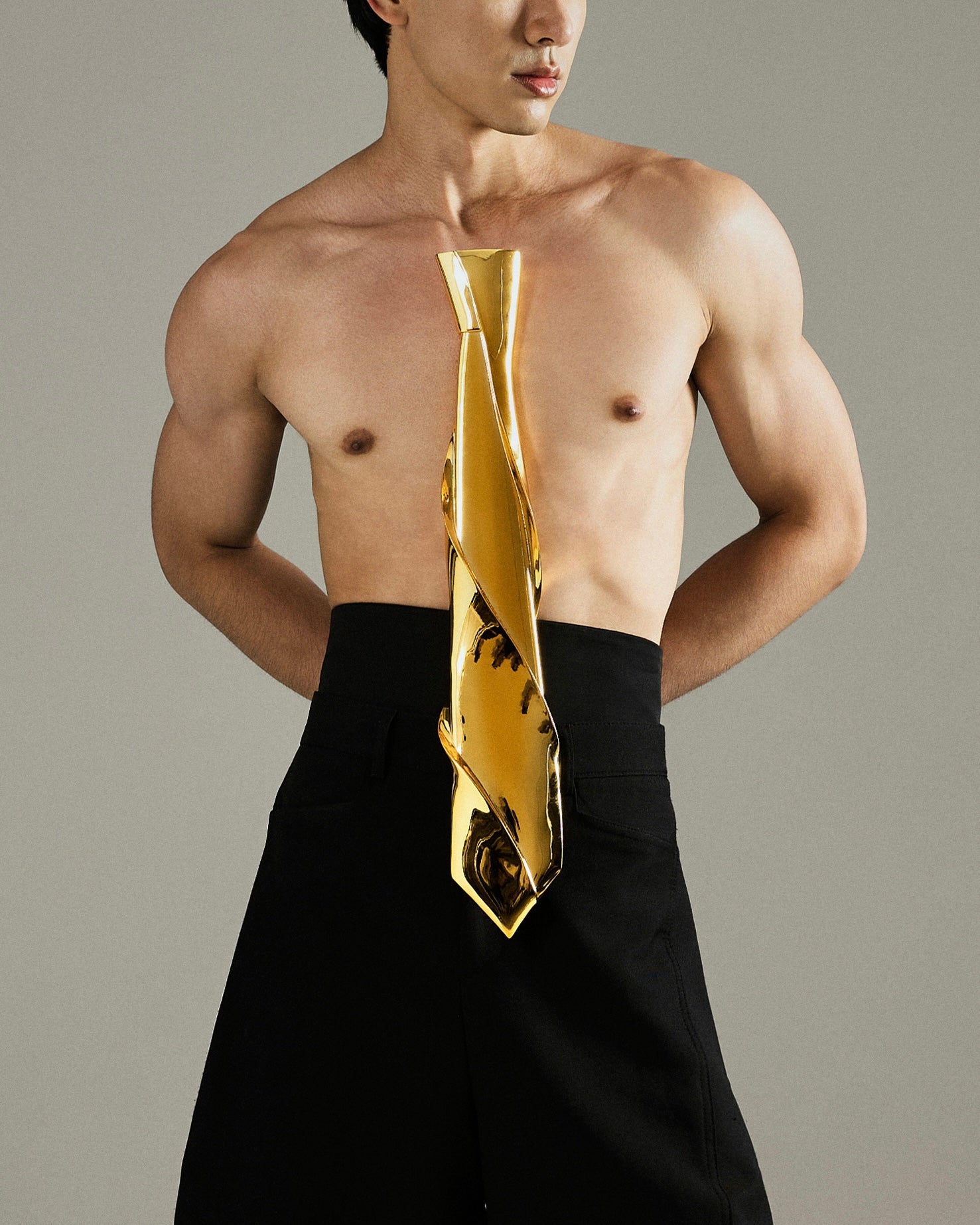 A 3D printed tie with a gold chrome finish. The piece merges a classic with curved forms which add depth and dimension, creating a statement piece that brings a surrealist touch to any look.