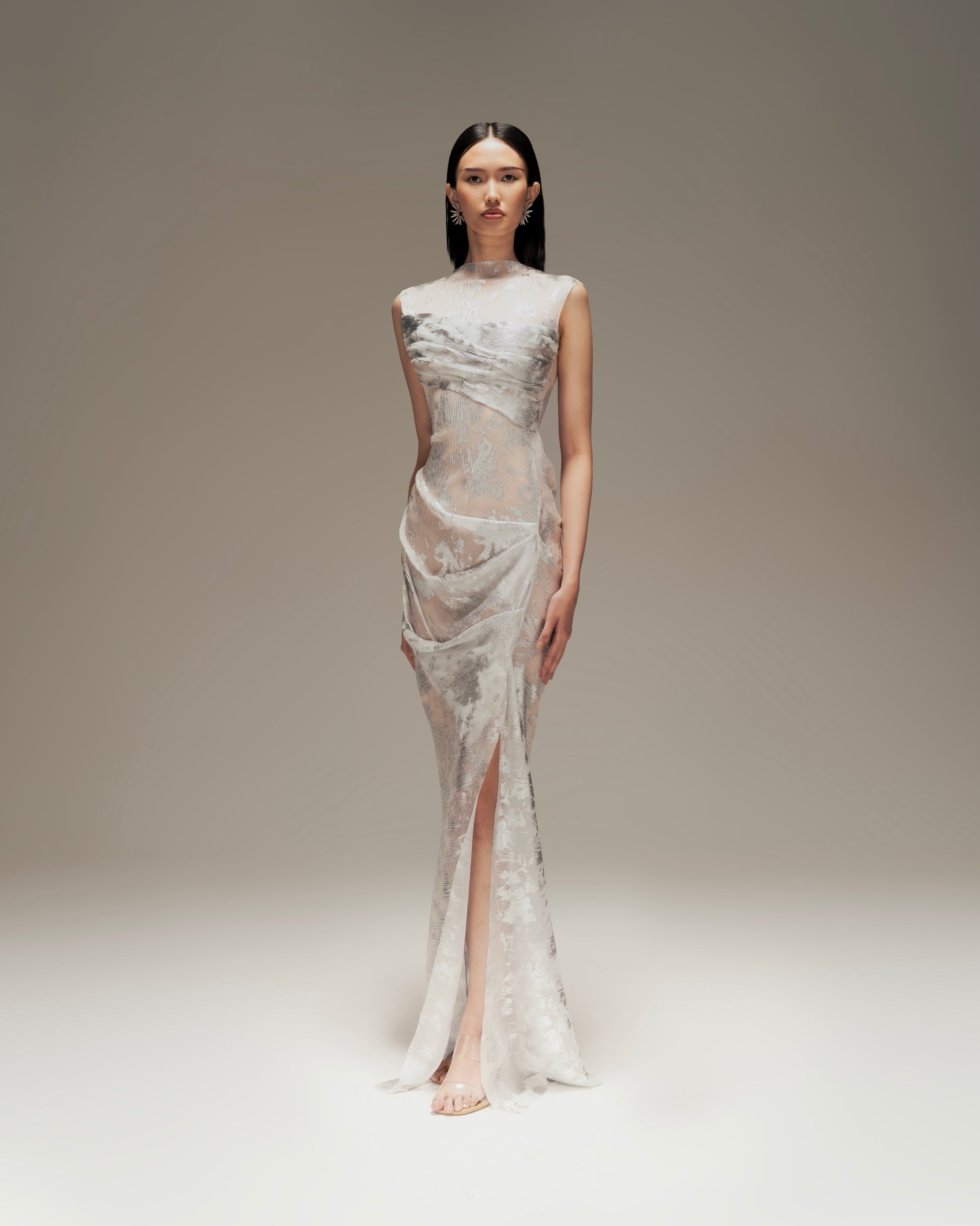 The sleeveless full-length dress features a stretch metallic fabric with a semi-sheer finish. The bodice features a high neckline and asymmetrical pleated detailing across the chest. The dress features a soft drape with a side slit that opens to the knee, introducing asymmetry and fluidity.